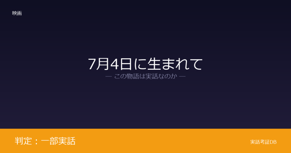 映画『7月4日に生まれて』は、1946年7月4日生まれの元海兵隊員ロン・コーヴィックが、ベトナム戦争での負傷と帰国後の苦悩を綴った1976年出版の自伝が原作です。映画クレジットに原作表記あり、コーヴィック本人が脚本に参加しているため判定は「一部実話」です。ただし一部の人物が統合されるなど映画的な脚色が加えられています。