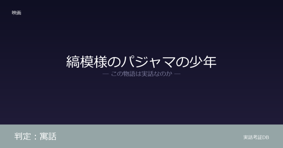 映画『縞模様のパジャマの少年』の判定は「実話ではない」です。原作者ジョン・ボインが本作を「寓話(fable)」と明言したフィクション小説であり、実話に基づくという公式情報は存在しません。
