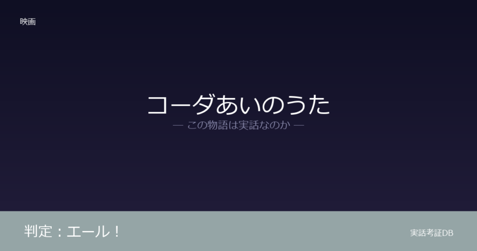 映画『コーダ あいのうた』の判定は「実話ではない」です。2014年のフランス映画『エール!』を原作とした英語リメイク作品であり、実在の家族やエピソードに基づく映画ではありません。