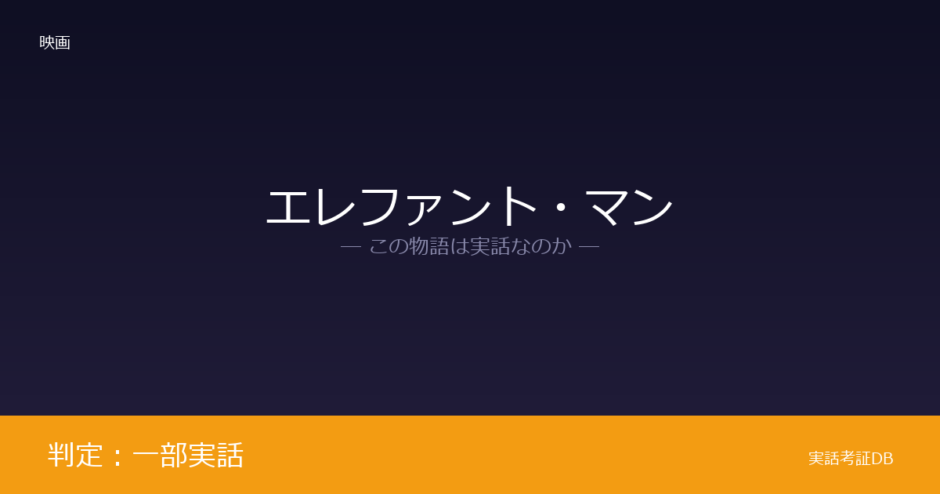 ただし「エレファント・マンは完全に実話」という認識は正確ではありません。前述のとおり、名前・興行師の人物像・ベルギー渡航の経緯・結末の描写など複数の点で史実と異なる脚色が加えられています。