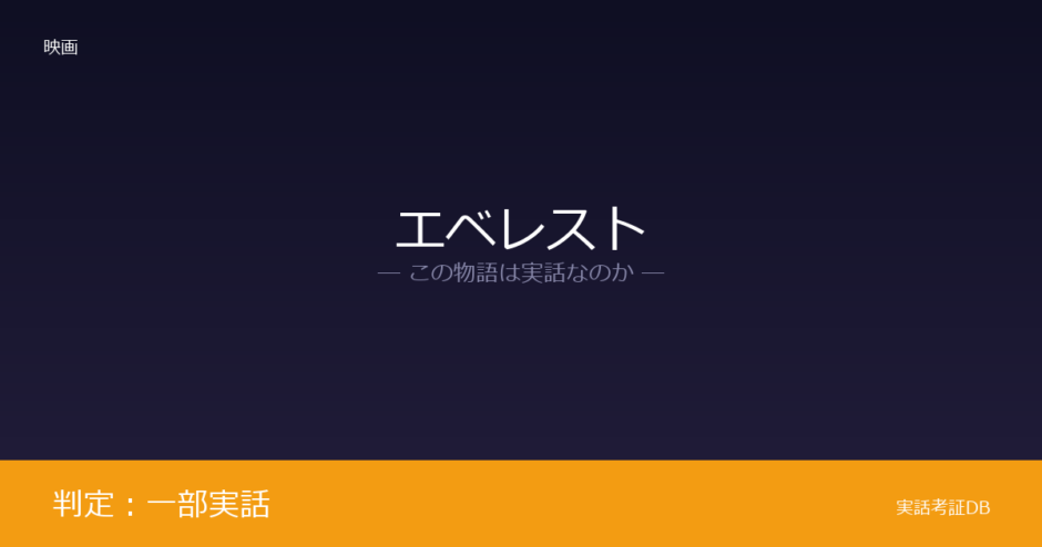 映画『エベレスト』(原題:Everest、2015年公開)は、1996年5月にエベレストで発生した大量遭難事故を基に制作された作品です。制作側は本作が実話に基づく作品であることを公式に明示しており、判定は「一部実話」です。登山家たちは実名で登場しますが、時系列の圧縮や人物描写の整理といった映画的再構成が加えられており、事故をそのまま再現した作品ではありません。