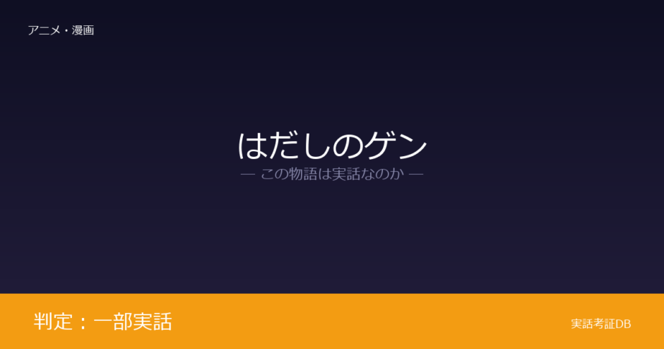 漫画『はだしのゲン』の判定は「一部実話」です。作者・中沢啓治が自身の被爆体験をもとに描いた自伝的作品ですが、ストーリーの多くには創作が含まれています。