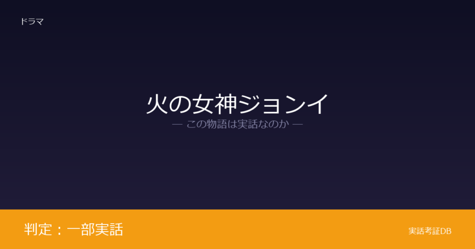 『火の女神ジョンイ』は、豊臣秀吉の朝鮮出兵で日本に渡り有田焼の発展に貢献した女性・百婆仙(ペク・パソン)をモデルとしたドラマです。放送局の番組紹介で公式にモデルが明記されているため判定は「一部実話」ですが、宮廷での恋愛や陰謀などドラマの大部分は創作であり、史実をそのまま描いた作品ではありません。