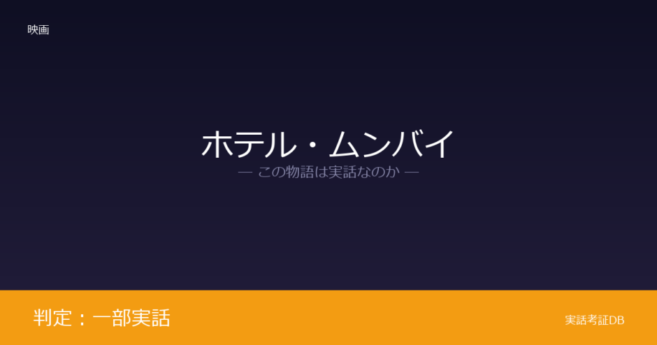 映画『ホテル・ムンバイ』は、2008年11月にインド・ムンバイで発生した同時多発テロ事件のうち、タージマハル・パレス・ホテルでの籠城事件を中心に描いた作品です。公式に実在の事件に基づく作品と明記されており、判定は「一部実話」です。ただし、主人公アルジュンをはじめ複数の登場人物は創作または複合キャラクターであり、事件をそのまま再現した映画ではありません。