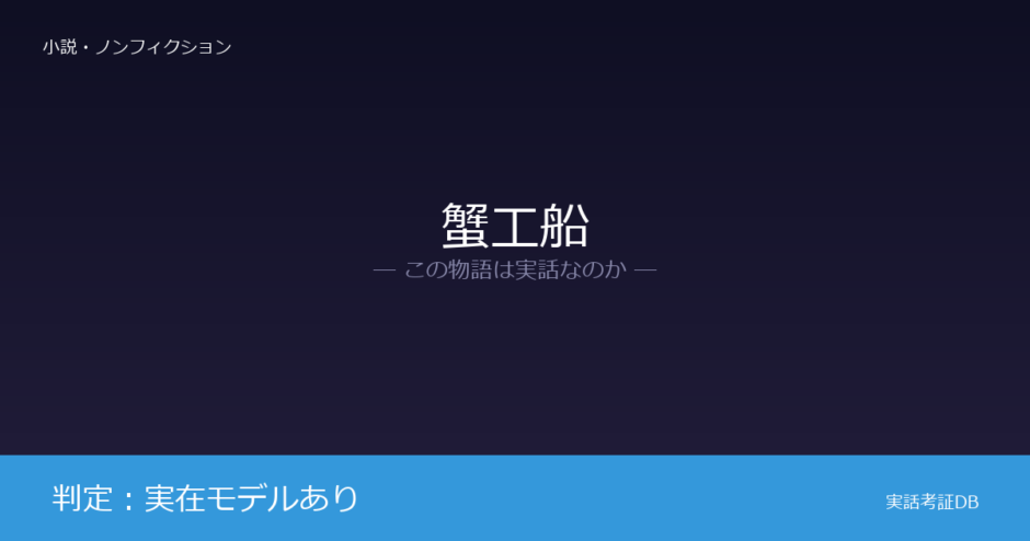 『蟹工船』は1926年に北洋漁業の蟹工船で実際に起きた漁夫・雑夫への虐待事件や遭難事故を素材としており、判定は「実在モデルあり」です。ただし特定の事件を忠実に再現した作品ではなく、複数の史実を組み合わせて独自の物語として再構成されているため、脚色度は「高」としています。