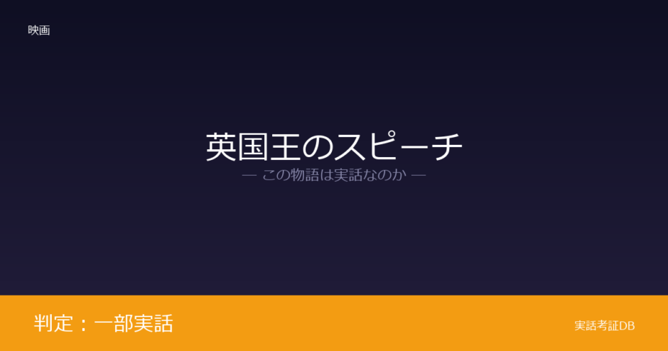映画『英国王のスピーチ』の判定は「一部実話」です。吃音に悩んだ英国王ジョージ6世と言語療法士ライオネル・ローグの実話に基づいていますが、治療期間や王室内の対立には脚色が加えられています。