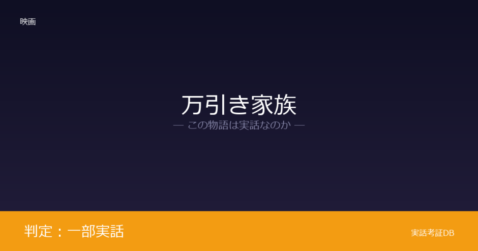 『万引き家族』は、2010年に東京都足立区で発覚した年金不正受給事件から着想を得た作品です。是枝裕和監督が複数のインタビューで事件をきっかけに制作したと語っており、判定は「一部実話」です。ただし万引きを軸にした疑似家族の物語は監督による創作であり、事件の忠実な再現ではありません。