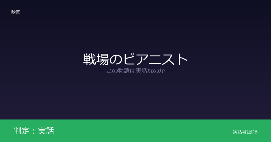 映画『戦場のピアニスト』の判定は「実話」です。原作はシュピルマン本人の回想録であり、主要な出来事は実際の体験に基づいています。