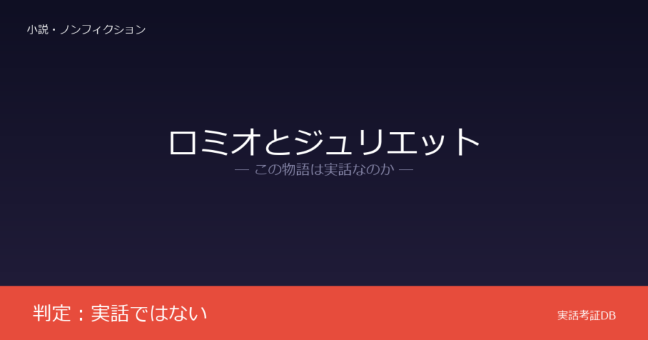 『ロミオとジュリエット』の物語に実話としての根拠は確認されていません。モンテッキ(モンタギュー)家とカプレーティ(キャピュレット)家は中世イタリアに実在した政治勢力ですが、両家の若者による悲恋という筋書きは文学的な創作です。判定は「実話ではない」、根拠ランクはC(原作・記録で文学的系譜が確認できる)としています。