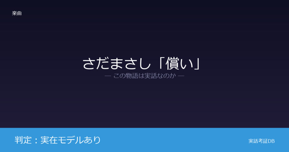 さだまさしの『償い』は本当にあった話なのでしょうか。さだ本人がコンサートのMCやインタビューで「知人から聞いた交通死亡事故の実話がもとになっている」と繰り返し語っています。ただし歌詞はその実話を物語として再構成したものであり、登場人物の名前や細部は創作です。判定は「実在モデルあり」となります。