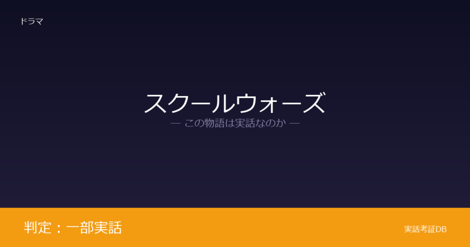 『スクール☆ウォーズ ~泣き虫先生の7年戦争~』は、京都市立伏見工業高等学校ラグビー部と監督・山口良治の実話をもとに、作家・馬場信浩が執筆したノンフィクション『落ちこぼれ軍団の奇跡』を原作としたドラマです。校名・人名・対戦相手・試合スコアなどに脚色が加えられているため、判定は「一部実話」となります。