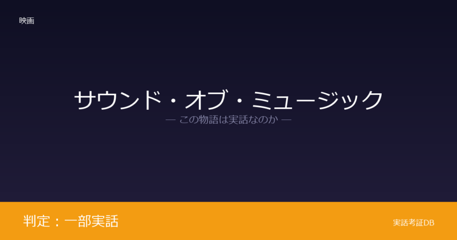 映画『サウンド・オブ・ミュージック』はマリア・フォン・トラップの自伝『The Story of the Trapp Family Singers』を原作とするミュージカルの映画化であり、判定は「一部実話」です。トラップ一家が実在し、ナチスのオーストリア併合後にアメリカへ亡命した事実は確認できますが、映画では亡命の経緯や人物像に大幅な脚色が加えられています。