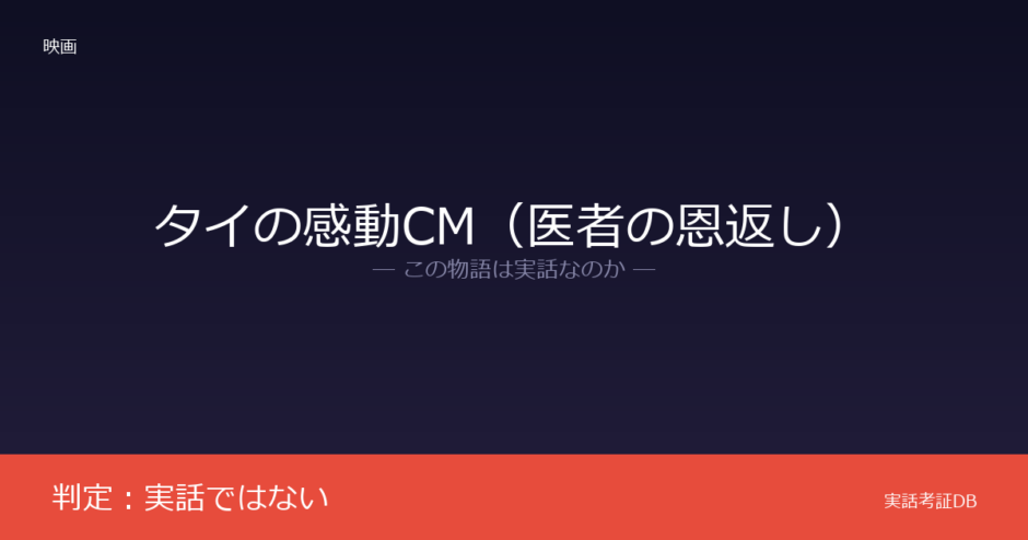 タイの通信会社TrueMove Hが2013年に公開したCM「Giving」は、少年時代に食堂の店主に助けられた人物が医者となり、30年後に恩返しをするという物語です。公開情報ベースでは、このCMが特定の実話に基づくという公式な根拠は確認できません。判定は「実話ではない」です。