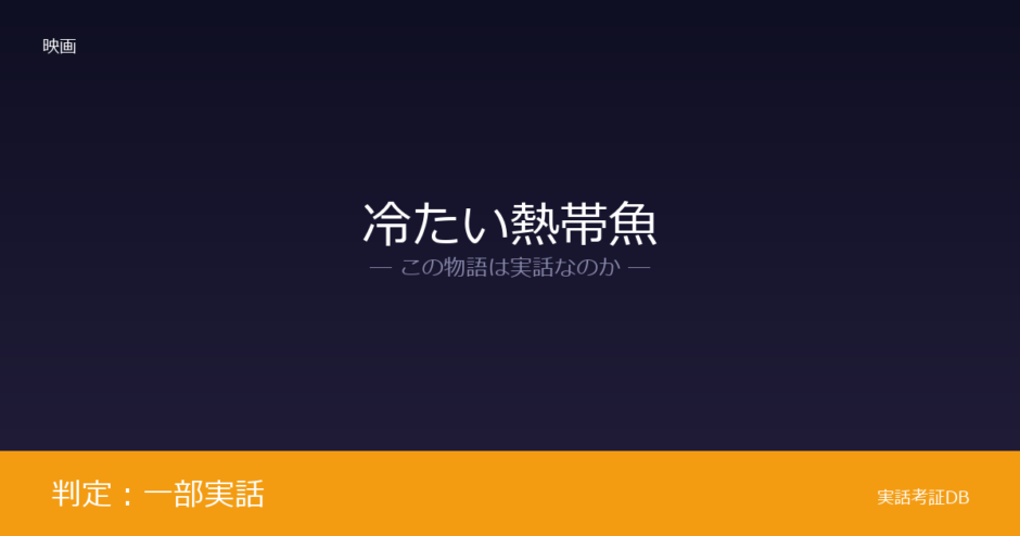 『冷たい熱帯魚』は実話をベースにした映画かという問いに対し、判定は「一部実話」です。1993年に埼玉県で発生した愛犬家連続殺人事件の報道・判決記録と作品内容が構造的に接続しており、園子温監督もインタビューで事件を題材にしたと認めています。ただし業種・人物・結末に大幅な脚色が加えられており、事件をそのまま描いた映画ではありません。