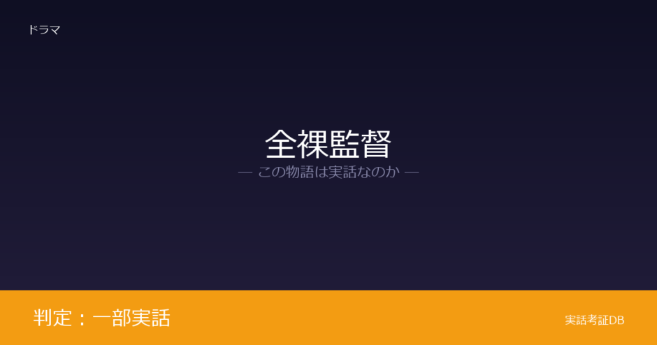 Netflixドラマ『全裸監督』の判定は「一部実話」です。実在のAV監督・村西とおるの半生を描いたノンフィクション書籍が原作であり、実際のエピソードが多数盛り込まれています。